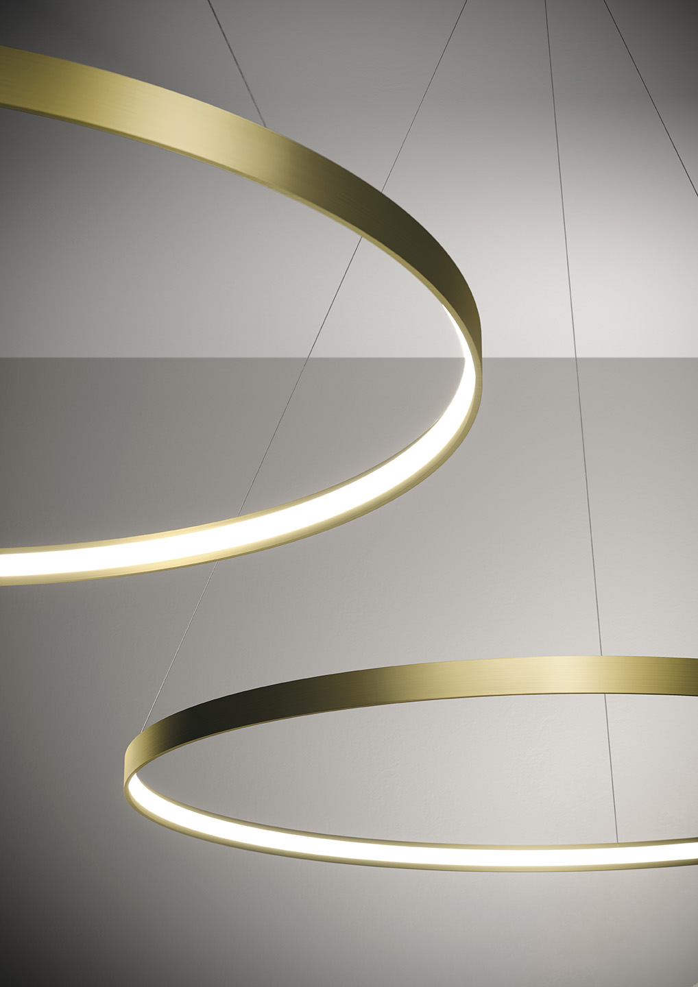 Lampada a sospensione nella forma tonda di diametro cm.78 in alluminio verniciato colore Oro Spazzolato, rosone in tinta, alimentatore a bordo. Cavi di alimentazione cm.150. 2761 lumen.