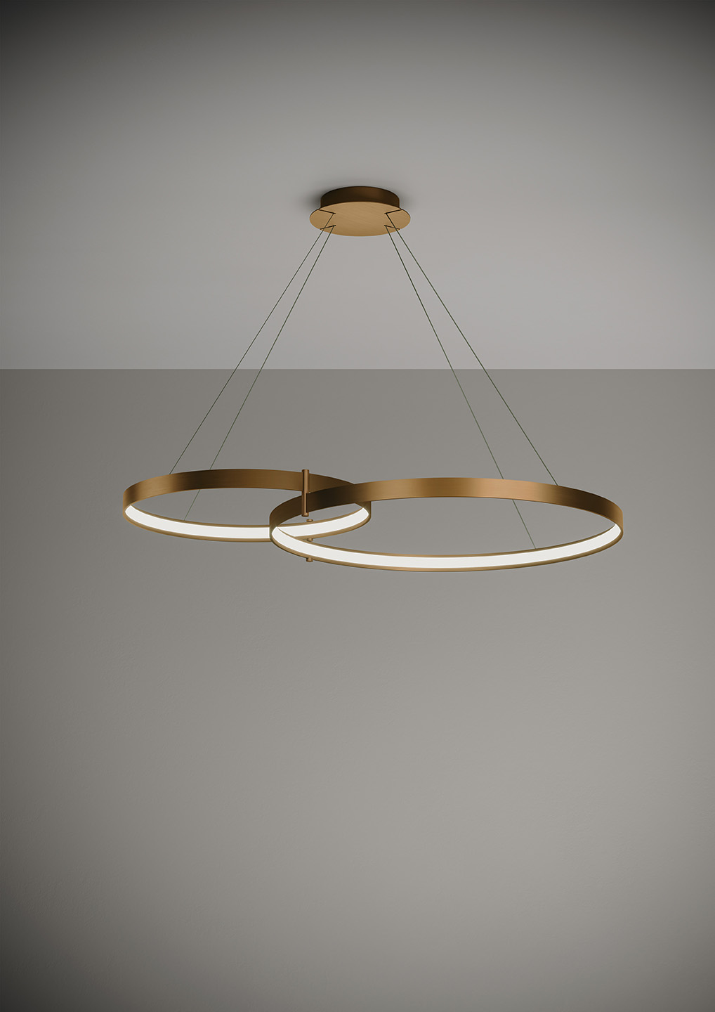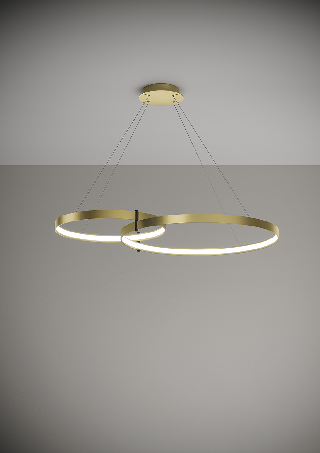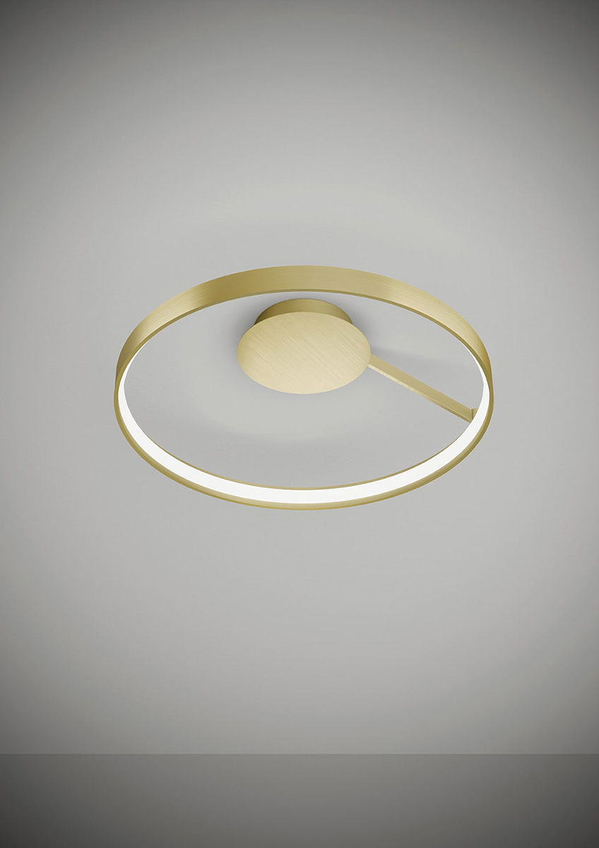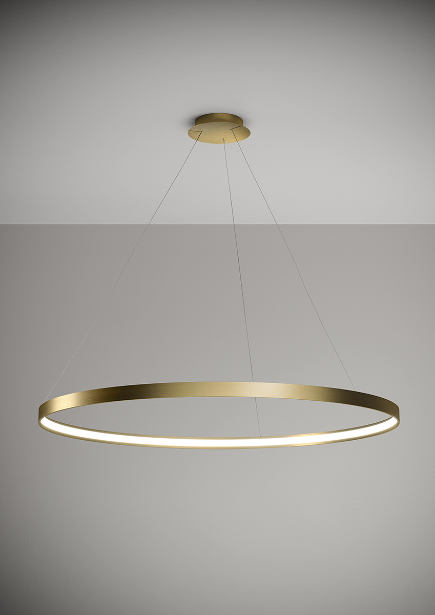 Lampada a sospensione nella forma tonda composta da due anelli: diametro cm.55 e diametro cm.78 in alluminio verniciato colore Oro Spazzolato, rosone in tinta, alimentatore a bordo. Cavi di alimentazione altezza cm.150. 5429 lumen.