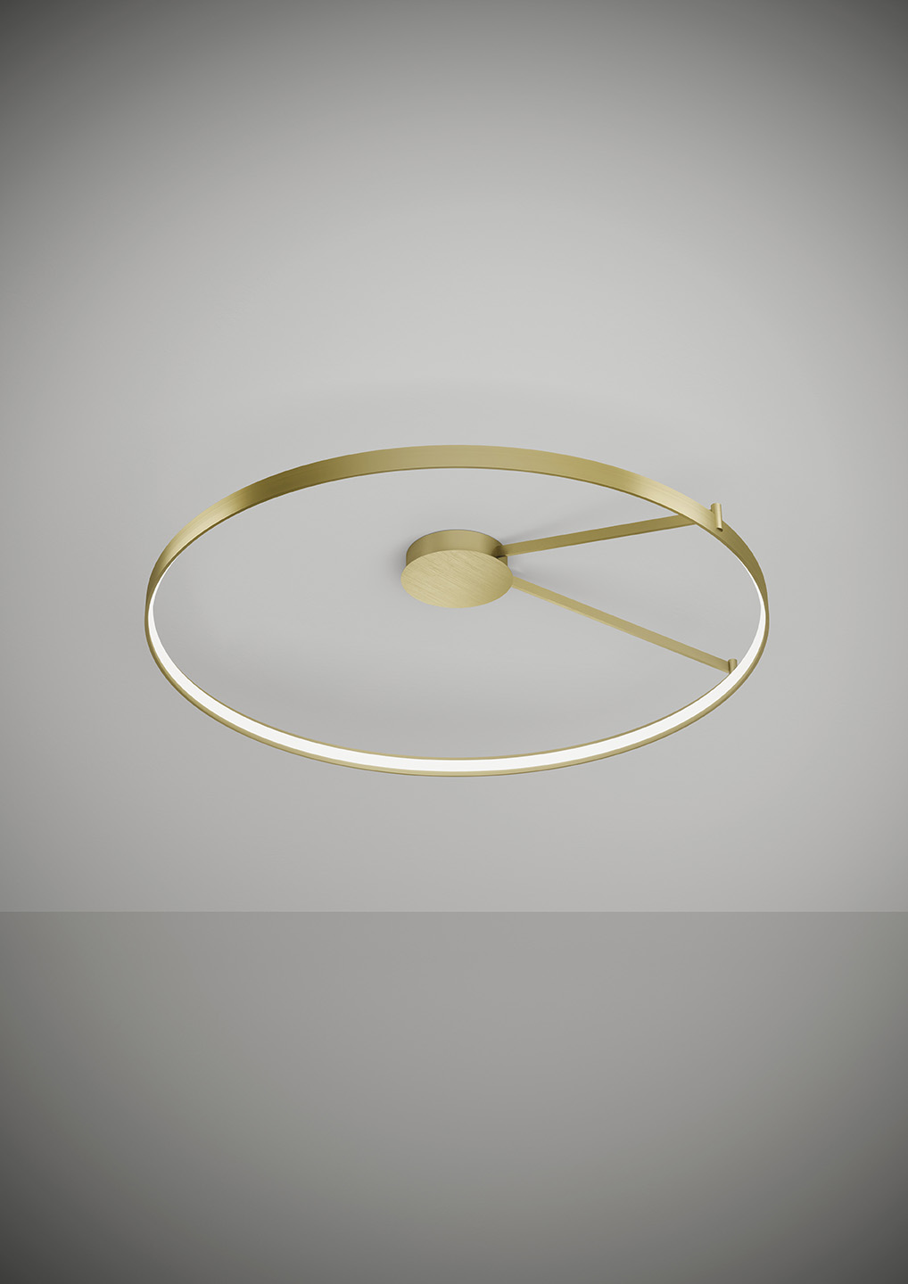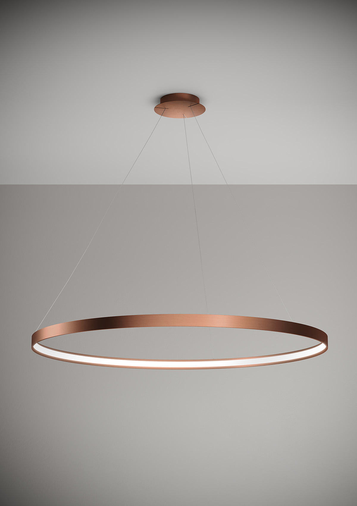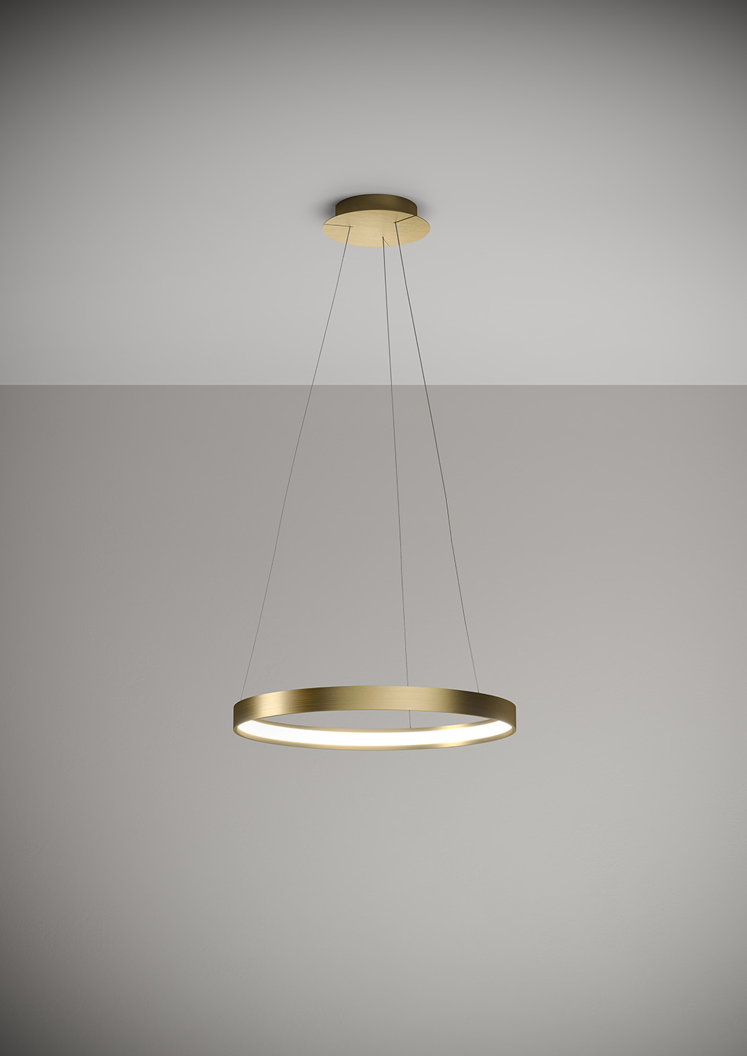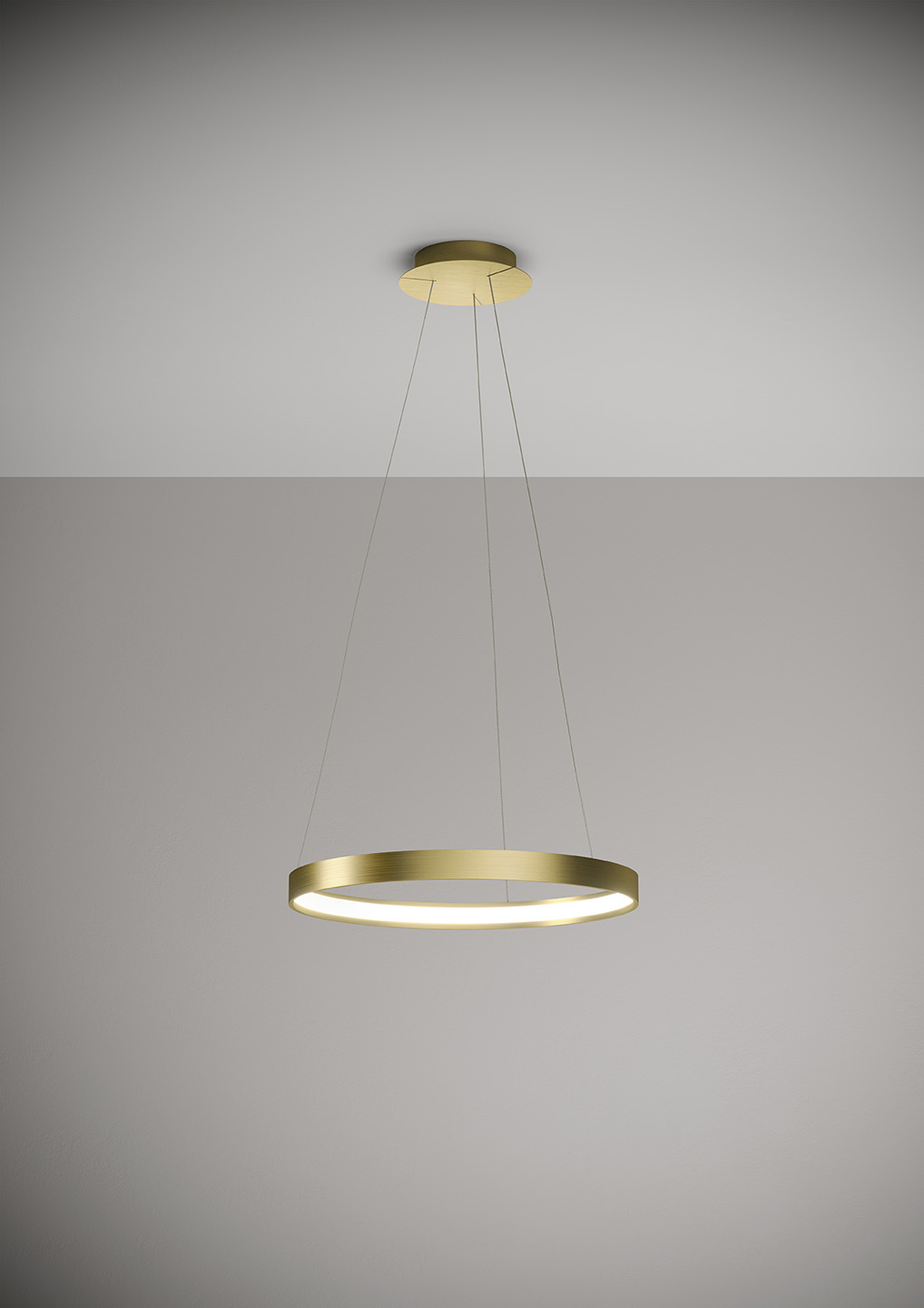 Lampada a sospensione nella forma tonda composta da due anelli: diametro cm.55 e diametro cm.78 in alluminio verniciato colore Oro Spazzolato, rosone in tinta, alimentatore a bordo. Cavi di alimentazione altezza cm.150. 5429 lumen.