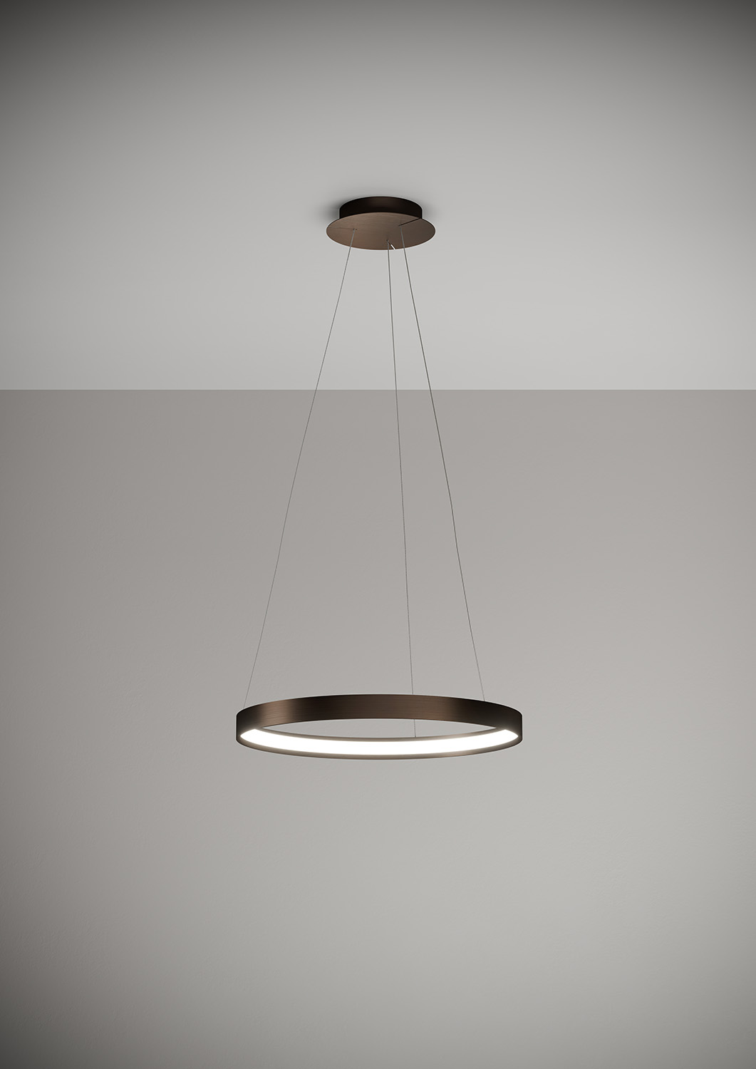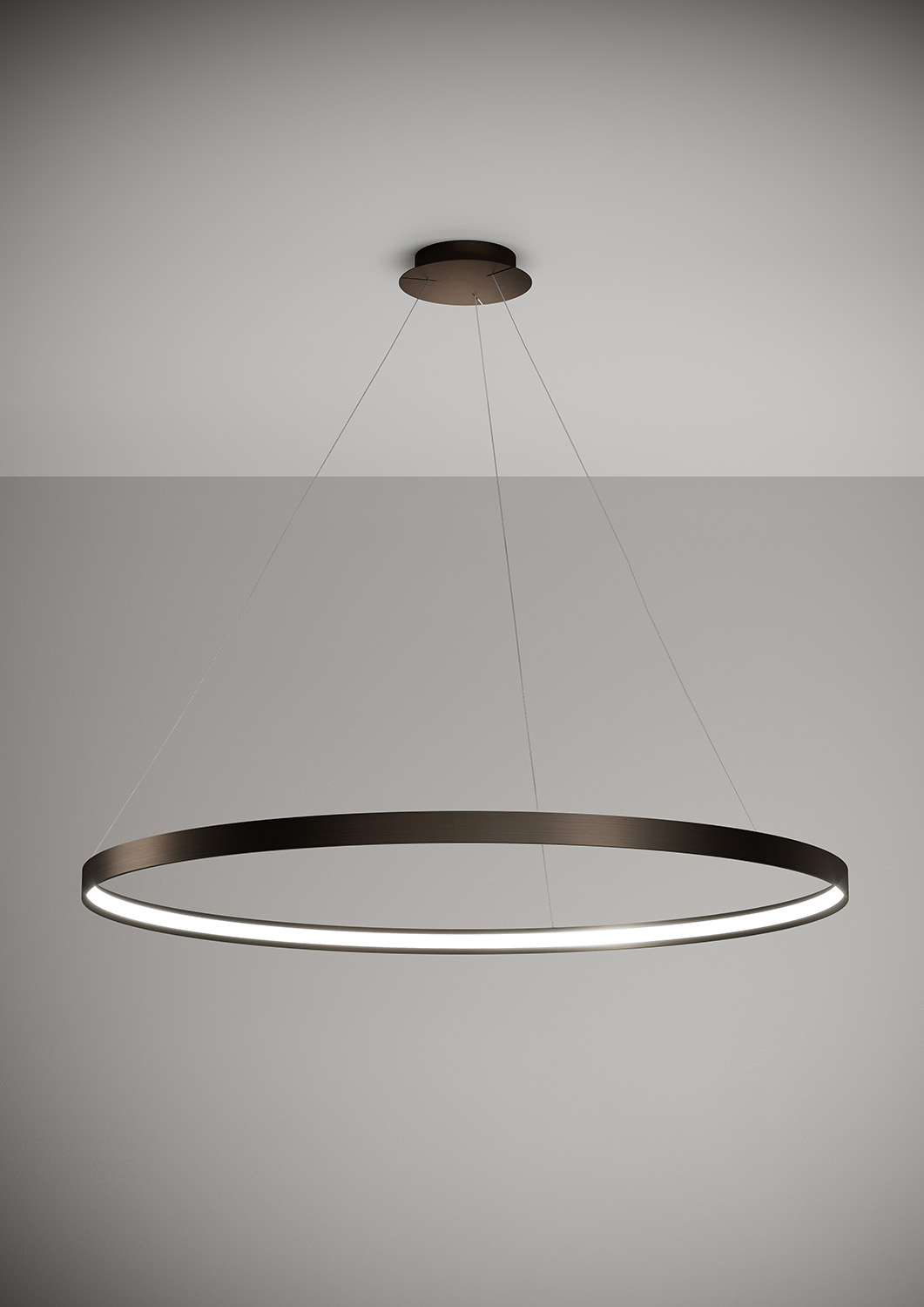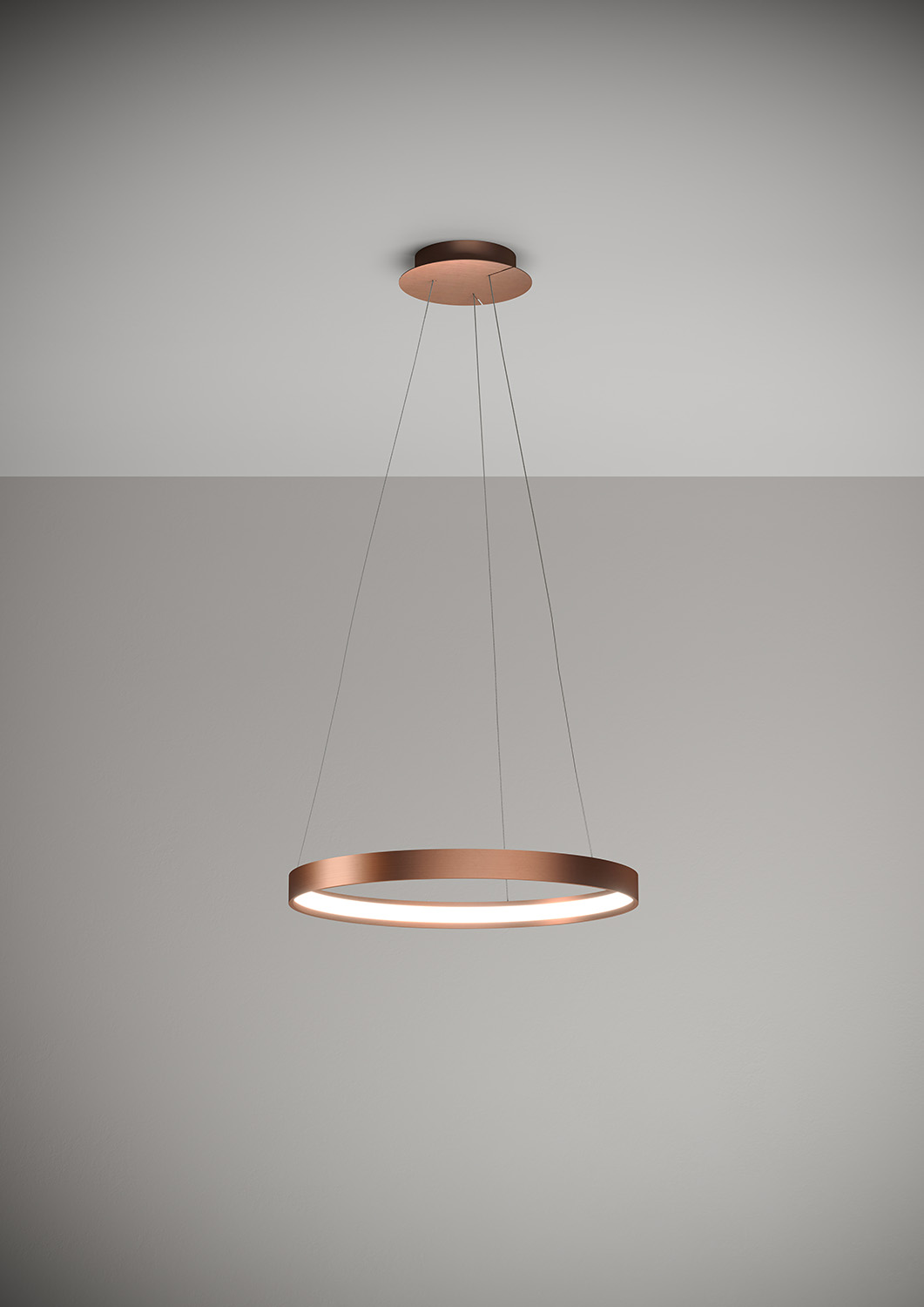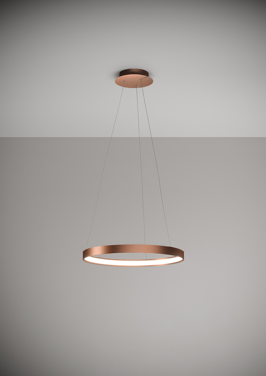 Lampada a sospensione nella forma tonda composta da due anelli: diametro cm.55 e diametro cm.78 in alluminio verniciato colore Oro Spazzolato, rosone in tinta, alimentatore a bordo. Cavi di alimentazione altezza cm.150. 5429 lumen.