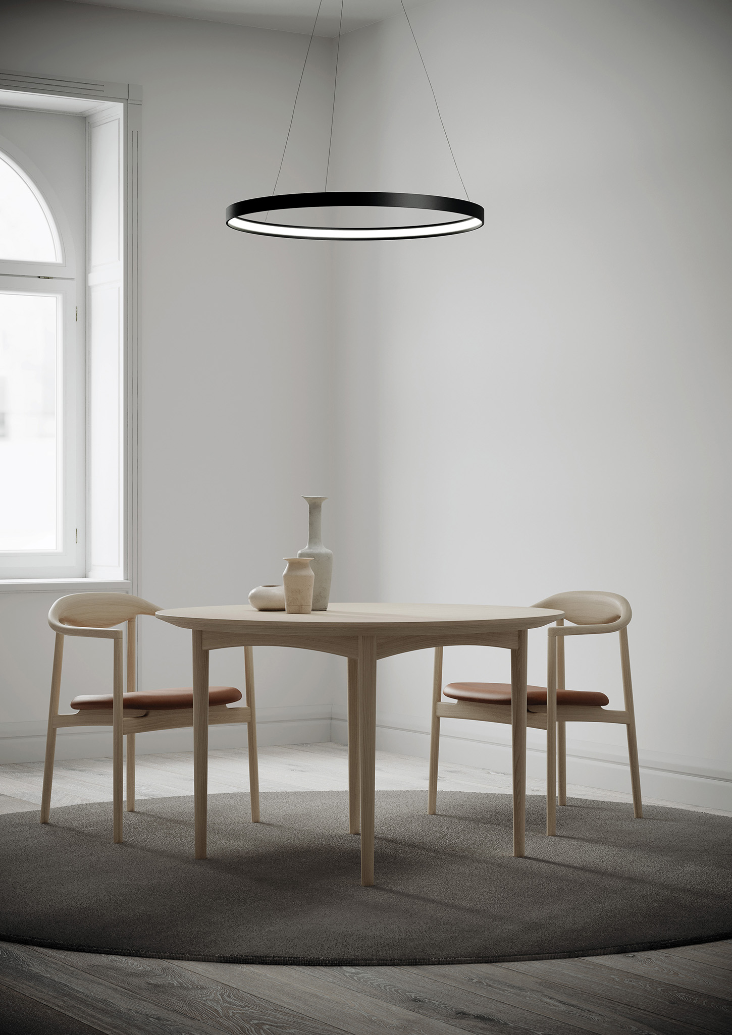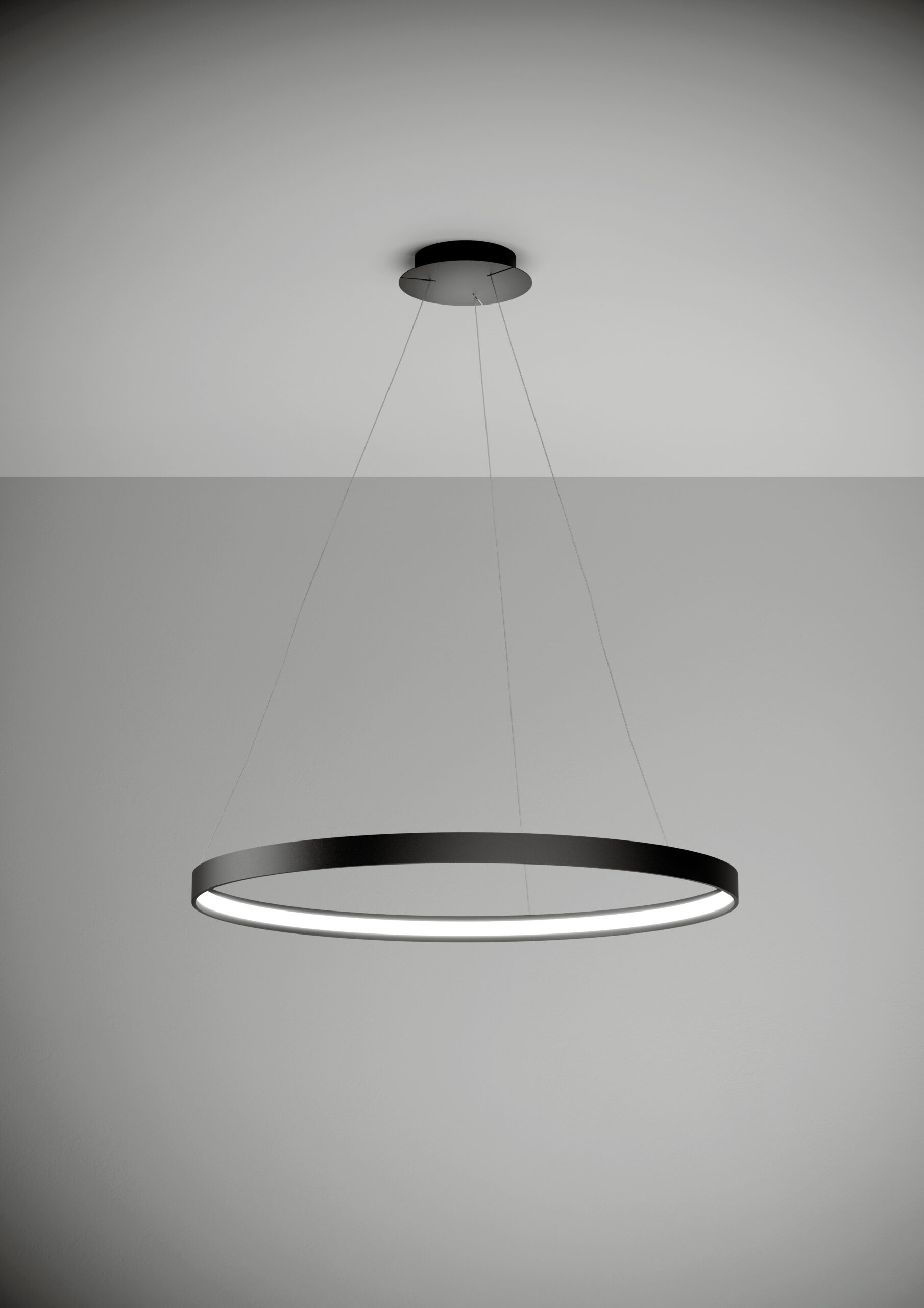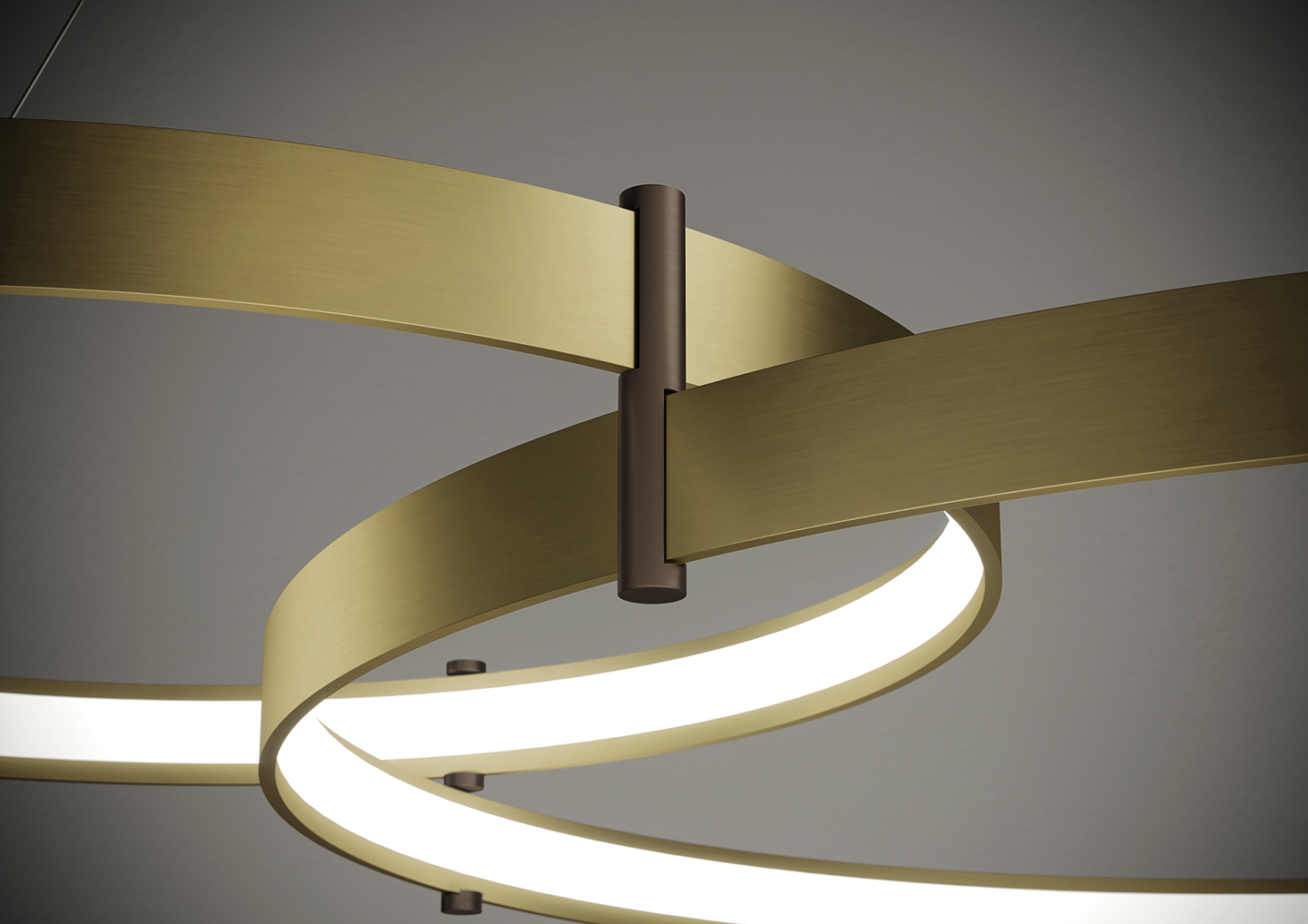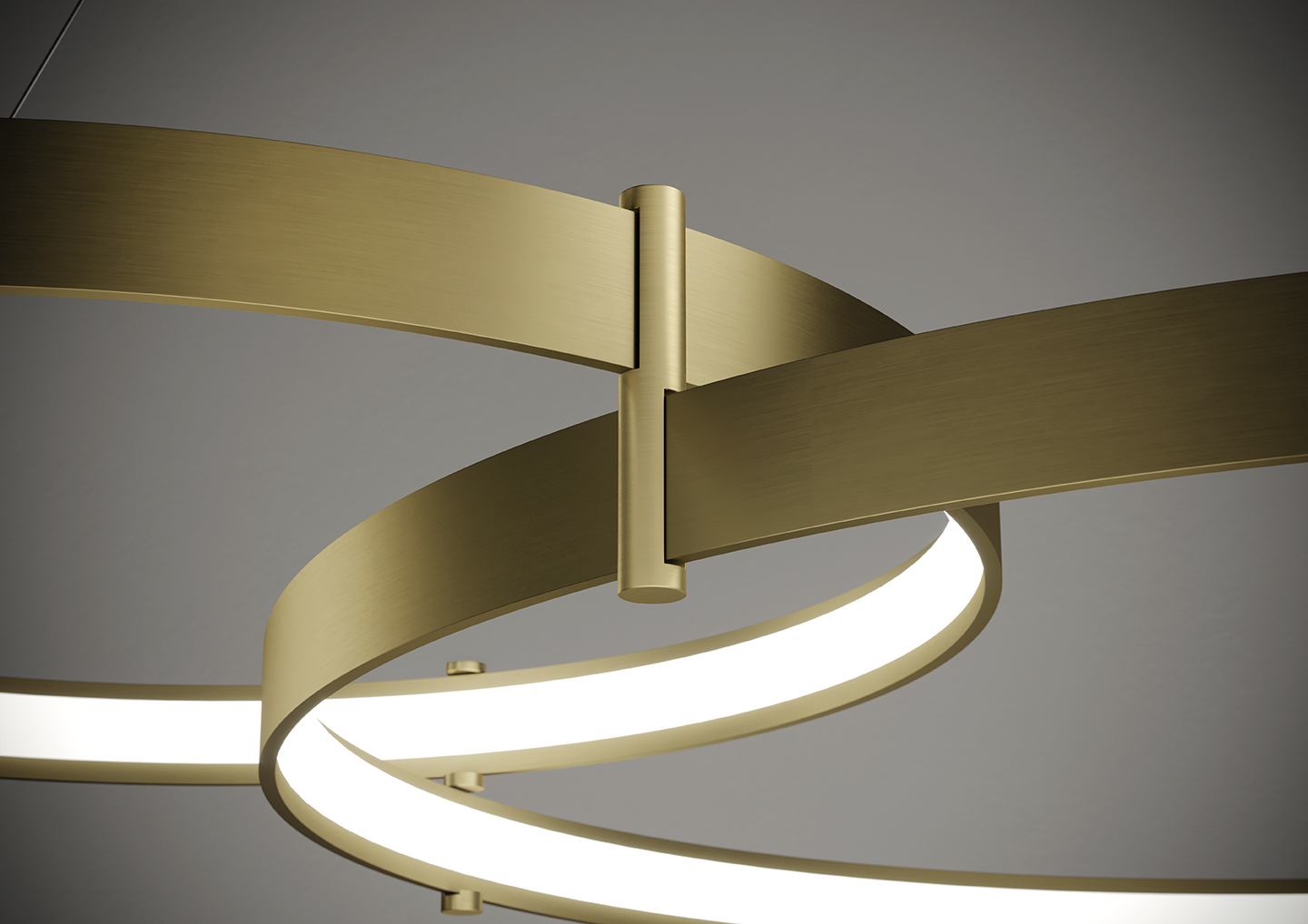 Lampada a sospensione nella forma tonda composta da due anelli: diametro cm.55 e diametro cm.78 in alluminio verniciato colore Oro Spazzolato, rosone in tinta, alimentatore a bordo. Cavi di alimentazione altezza cm.150. 5429 lumen.